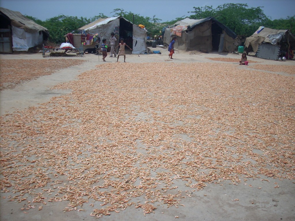 Same cracked land is now filled with rain water and sea water intruded from mouth of Rann. This makes it brackish water lake, an ideal natural prawn habitat.